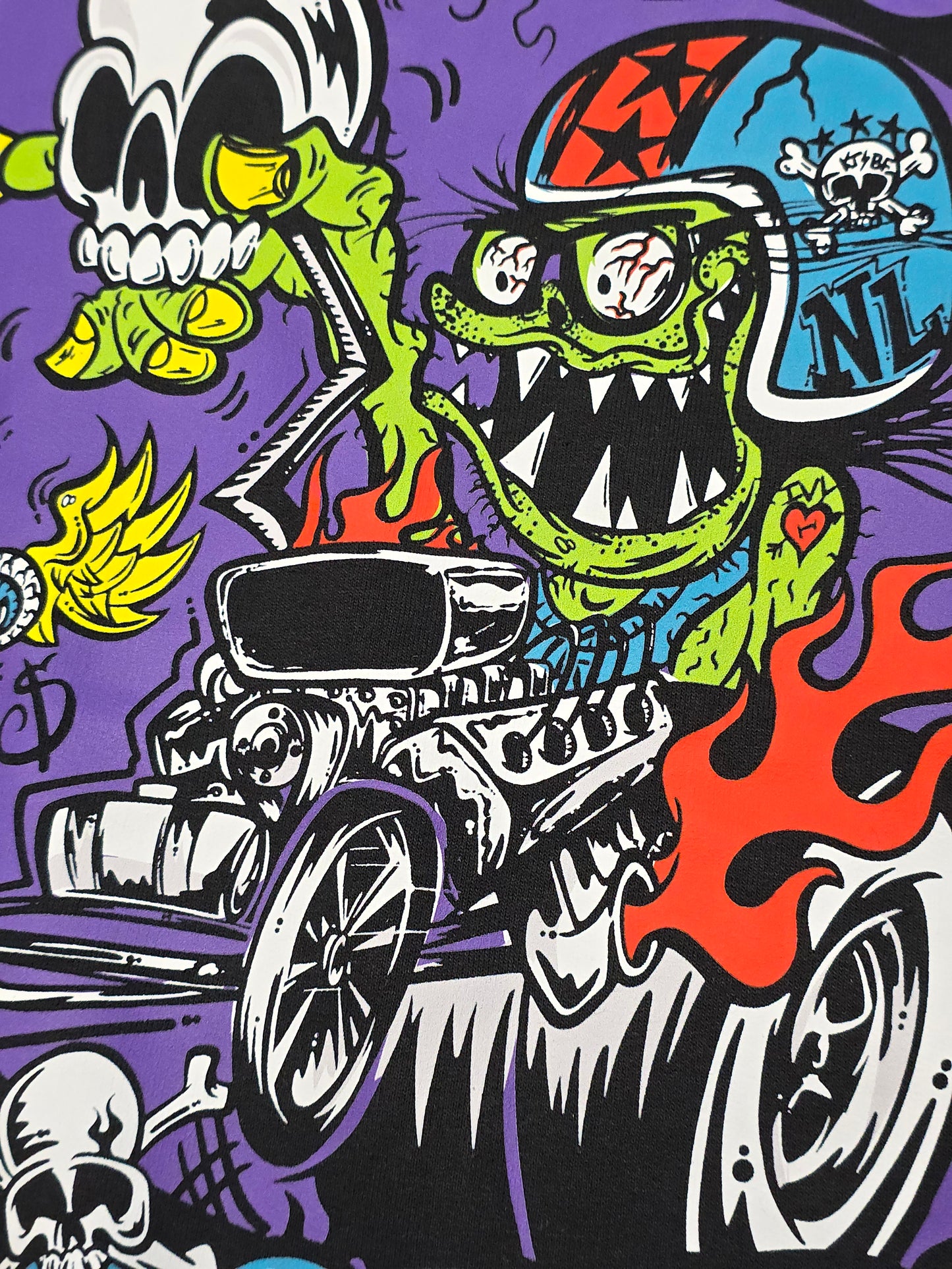 This highly popular and vibrantly colored artwork, screams hot rod culture. At the forefront is a mischievously grinning fink weirdo, rippin' it up in a fire breathing front-end dragster, setting the stage for an absurdly cartoonesque scene.