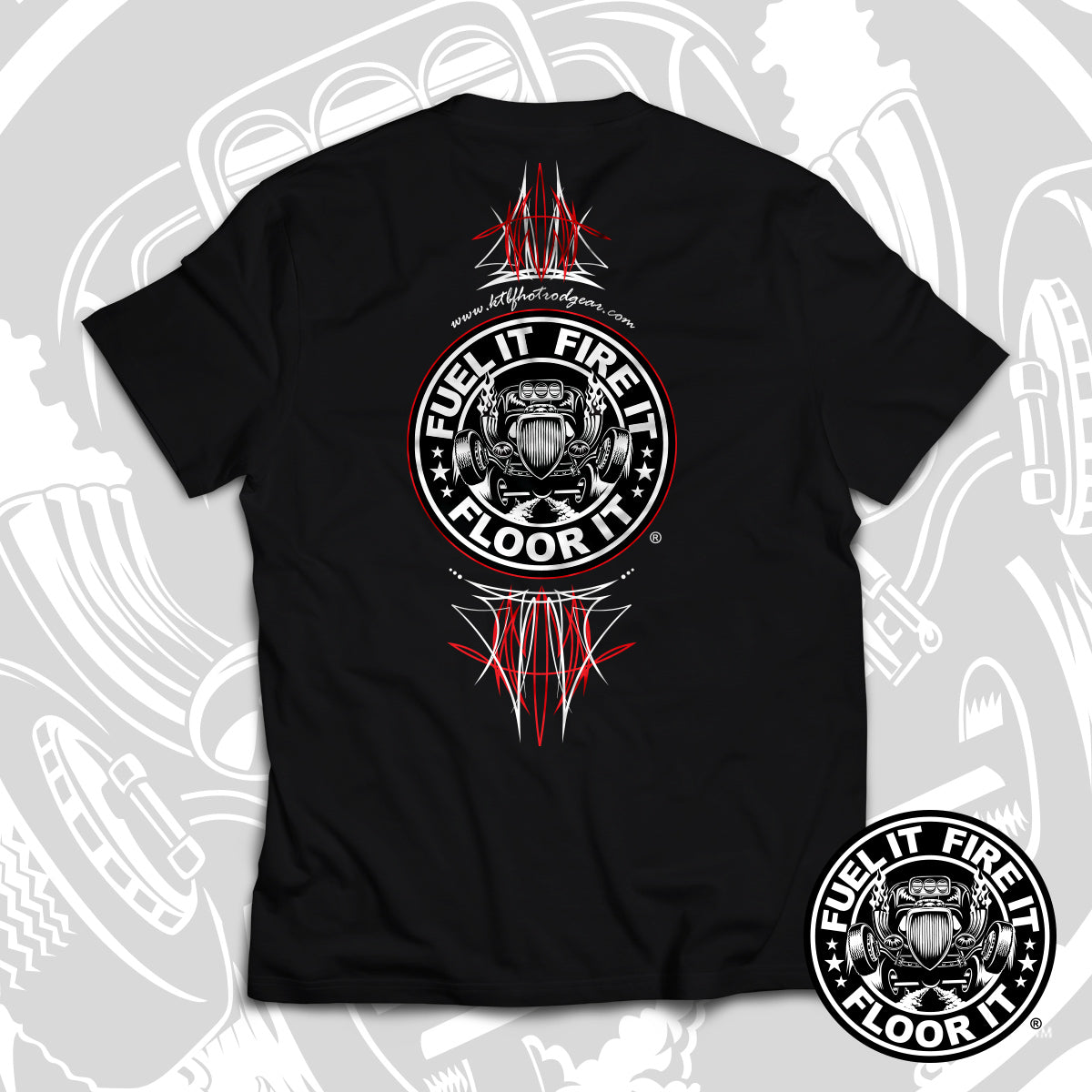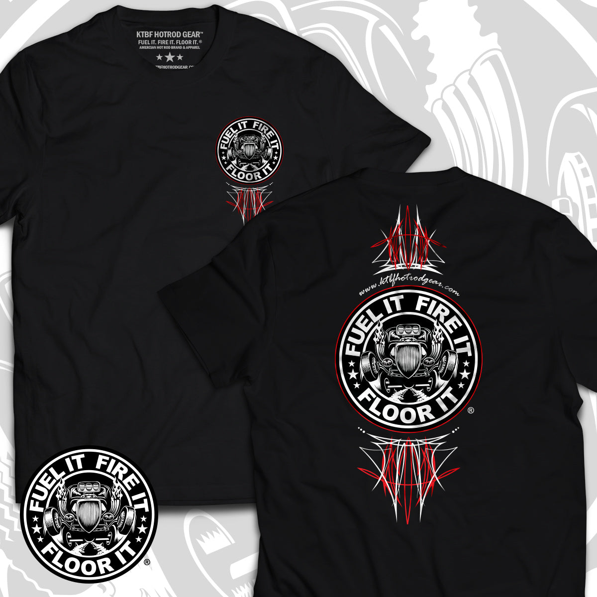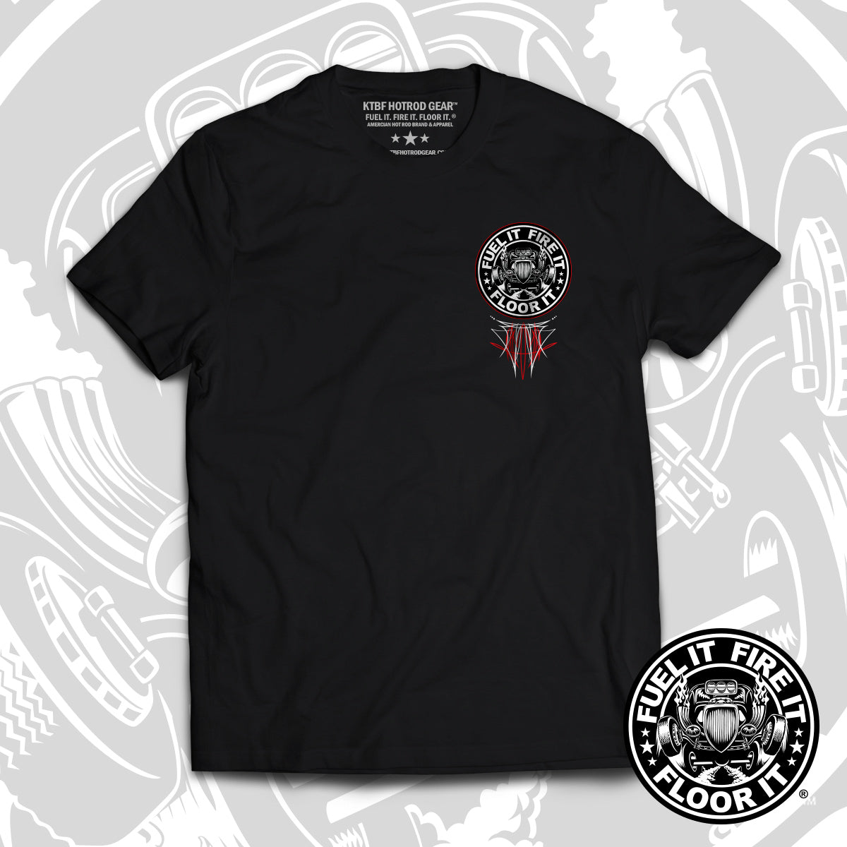 The “Pinstripe” Tee is a fan-favorite and one of KTBF® best-selling designs — built for those who live life wide open. This killer two-sided shirt rocks the iconic Fuel It, Fire It, Floor It® logo on one side and bold custom pinstriping on the other. Cut from a premium 60% cotton / 40% polyester blend, it’s lightweight, tagless, and tough as nails — smooth, comfortable, and ready to roll. Whether you’re wrenchin’, cruisin’, or lightin’ up the pavement, this tee is made for hot rodders who don’t lift.